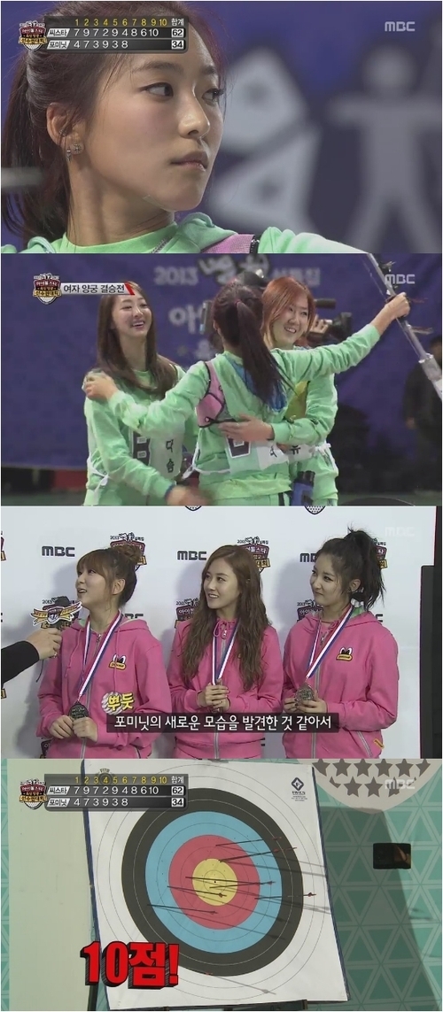 씨스타와 포미닛은 11일 오후 방송된 MBC 설 특집 예능프로그램 ‘아이돌스타 육상 양궁 선수권 대회’(이하 ‘아육대’)에서 양궁 결승전에서 만났다.