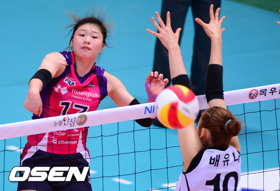 11일 오후 인천 도원체육관에서 열린 '2012-2013 NH농협 V-리그' 여자부 흥국생명과 GS칼텍스의 경기, 2세트 흥국생명 이진화가 GS 배유나의 블로킹을 피해 공격을 시도하고 있다.