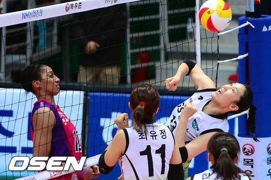 경기 3세트 GS칼텍스 정대영이 흥국생명 휘트니와 네트 플레이를 펼치다 자신의 코트로 넘어오는 공을 바라보고 있다. / youngrae@osen.co.kr