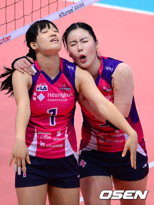 경기 2세트 흥국생명 김혜진과 김사니가 GS칼텍스 베띠의 스파이크에 득점을 허용하자 아쉬운 표정을 짓고 있다. / youngrae@osen.co.kr