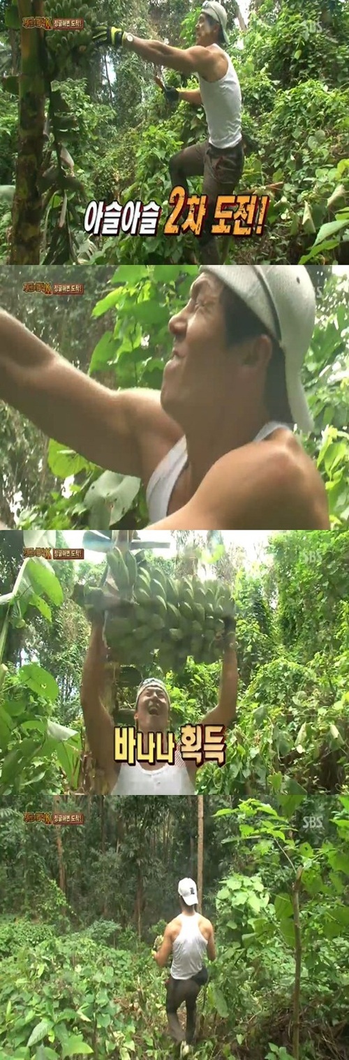 이에 이정용은 민소매만을 입은 채 바나나 따기에 도전했고, 우람한 근육을 자랑하며 큰 바나나 따기에 성공했다.