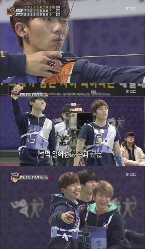 제국의 아이들과 엠블랙은 11일 오후 방송된 MBC 설 특집 예능프로그램 ‘아이돌스타 육상 양궁 선수권 대회’(이하 ‘아육대’) 남자 단체 양궁에서 지난 대회에 이어 결승전에서 만났다.