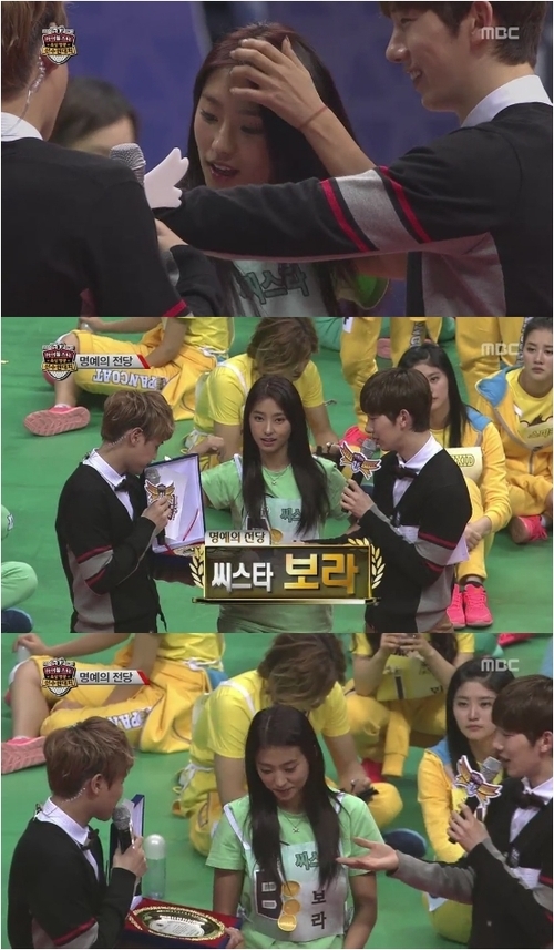 앞서 보라는 더 이상 ‘아육대’에서 육상 경기에 참여하지 않겠다고 은퇴선언을 한 바 있다. 후배들에게 금메달을 양보하기 위한 것. 결국 보라는 마지막 육상 경기에서 결승전 포기 후 제작진이 수여하는 명예의 전당에 올랐다.