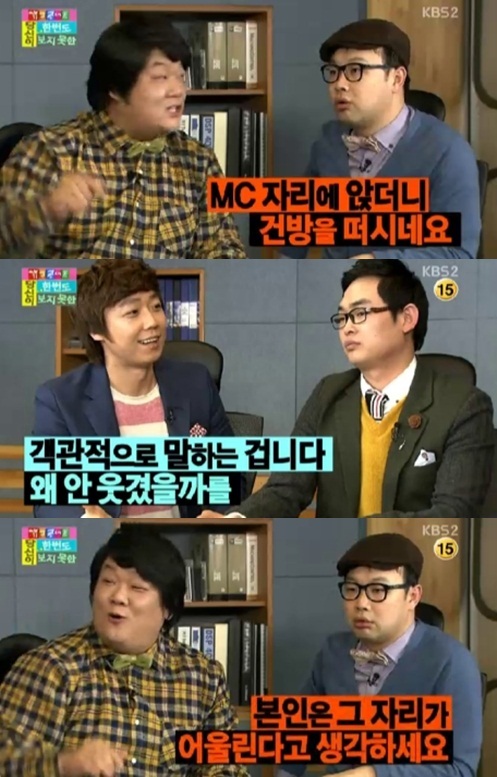또 김기열은 “인기 없는 사람들끼리는 뭉쳐서는 안 된다”고 통편집 원인을 분석 했지만 유민상은 “MC 자리에 앉더니 건방을 떤다. 설 특집에 김기열이 MC라는 거는 말이 되냐. 옆방만 가도 잘 나가는 사람이 얼마나 많냐”고 독설을 내뱉어 눈길을 끌었다.