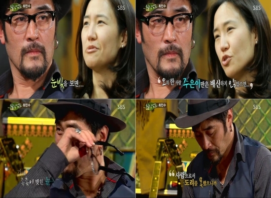 '힐링캠프'에 출연한 최민수가 2년동안 산에서 지냈던 시절을 회상하는 아내의 인터뷰 영상을 보고 눈물을 흘렸다.