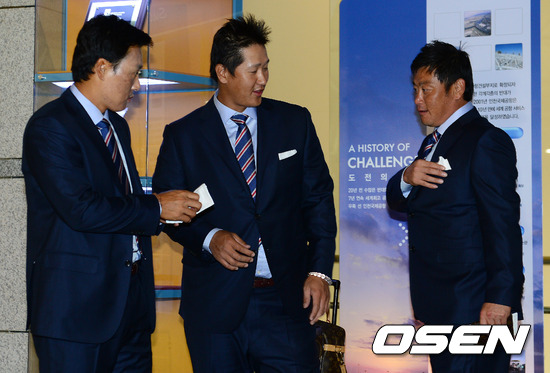 이승엽, 이대호, 진갑용이 이야기를 나누며 즐거워하고 있다.