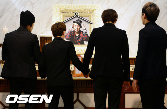 故 임윤택의 빈소에서 조문객들의 조문이 이어지고 있는 가운데 울랄라세션 멤버들이 영정에 조문을 하고 있다.