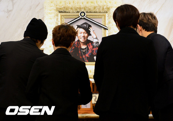故 임윤택의 빈소에서 조문객들의 조문이 이어지고 있는 가운데 울랄라세션 멤버들이 슬픔을 삼키고 있다.