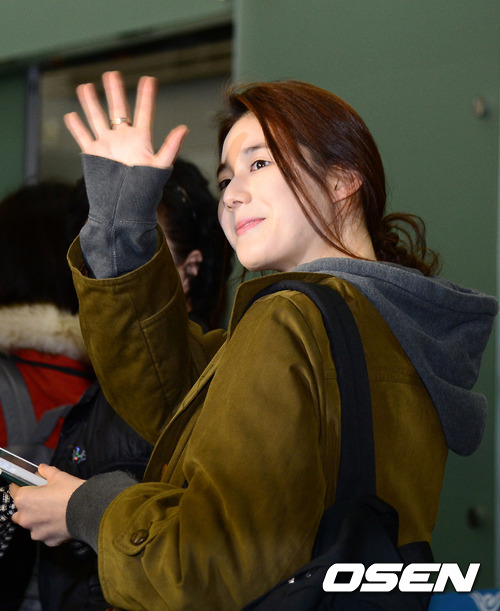 정은채가 출국전 취재진을 향해 손을 흔들고 있다.