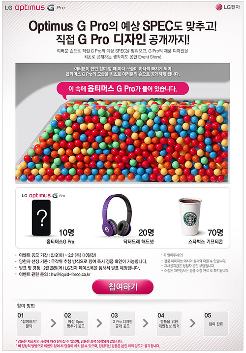 '스펙 예측 이벤트'를 마치면 'G Pro 디자인 공개 이벤트' 페이지가 바로 열린다. 'G Pro 디자인 공개 이벤트'는 소비자 참여로 '옵티머스 G Pro' 외관을 서서히 공개하는 이색 이벤트다. 페이스북의 '좋아요'를 누를 때마다 제품을 가리고 있던 구슬이 하나씩 줄어들면서 ‘옵티머스 G Pro’가 조금씩 베일을 벗는다. 소비자들의 참여가 활발할수록 '옵티머스 G Pro' 디자인을 더 빨리 볼 수 있게 된다. 'G Pro 디자인 공개 이벤트'까지 참여하면 즉시 경품 당첨 여부를 확인할 수 있다.