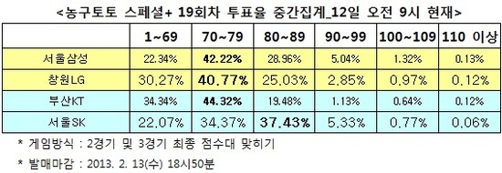 공동 7위를 달리고 있는 팀들 간의 대결로 관심을 모으는 서울삼성-창원LG(1경기) 전에서는 서울삼성과 창원LG 양 팀 모두 70점대가 각각 42.22%, 40.77%로 가장 높게 집계 돼 박빙승부를 펼칠 것이라는 예상이 많았다.