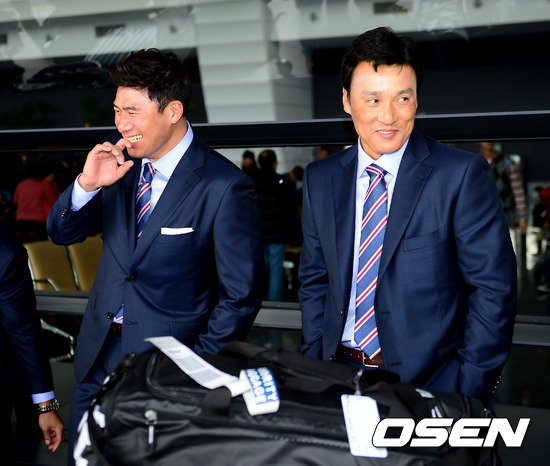 서재응, 이승엽이 이야기를 나누며 즐거워하고 있다.