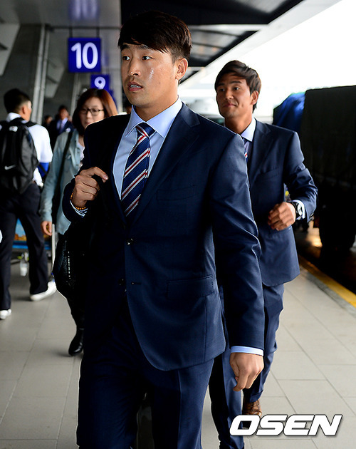 손아섭이 버스를 타기 위해 입국장을 나서고 있다.