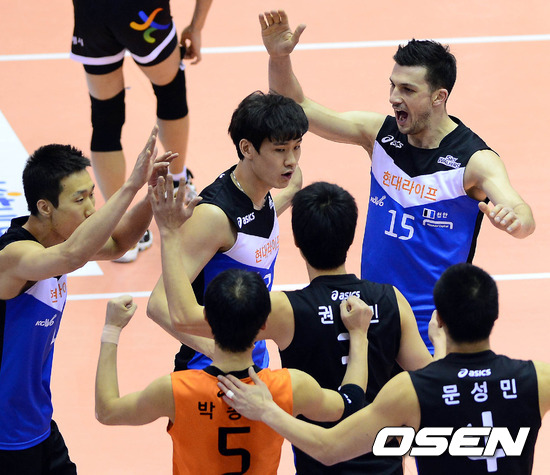 12일 오후 충남 아산시 이순신체육관에서 열린 '2012-2013 NH농협 V-리그' 남자부 아산 러시앤캐시와 천안 현대캐피탈의 경기 1세트 현대캐피탈 선수들이 득점 후 기뻐하고 있다.