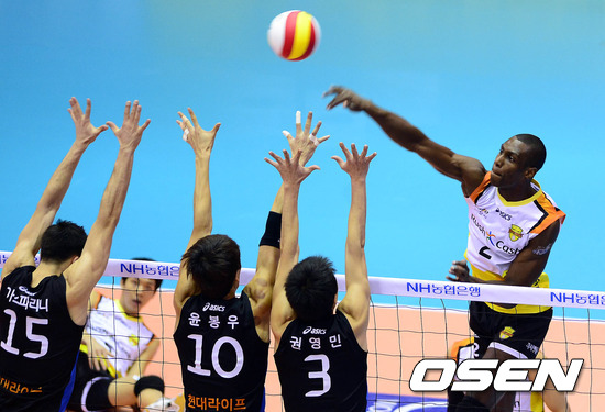12일 오후 충남 아산시 이순신체육관에서 열린 '2012-2013 NH농협 V-리그' 남자부 아산 러시앤캐시와 천안 현대캐피탈의 경기 1세트 다미가 공격을 시도하고 있다.