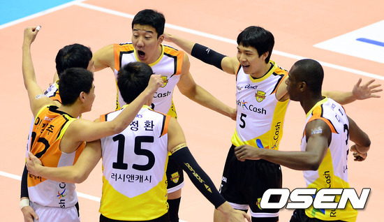 12일 오후 충남 아산시 이순신체육관에서 열린 '2012-2013 NH농협 V-리그' 남자부 아산 러시앤캐시와 천안 현대캐피탈의 경기 2세트 러시앤캐시 선수들이 득점 후 환호하고 있다.
