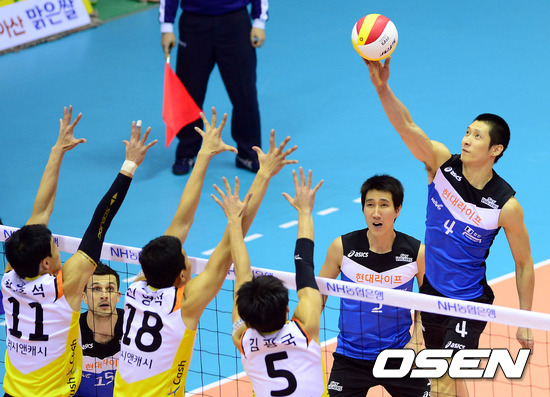 12일 오후 충남 아산시 이순신체육관에서 열린 '2012-2013 NH농협 V-리그' 남자부 아산 러시앤캐시와 천안 현대캐피탈의 경기 2세트 문성민이 공격을 시도하고 있다.