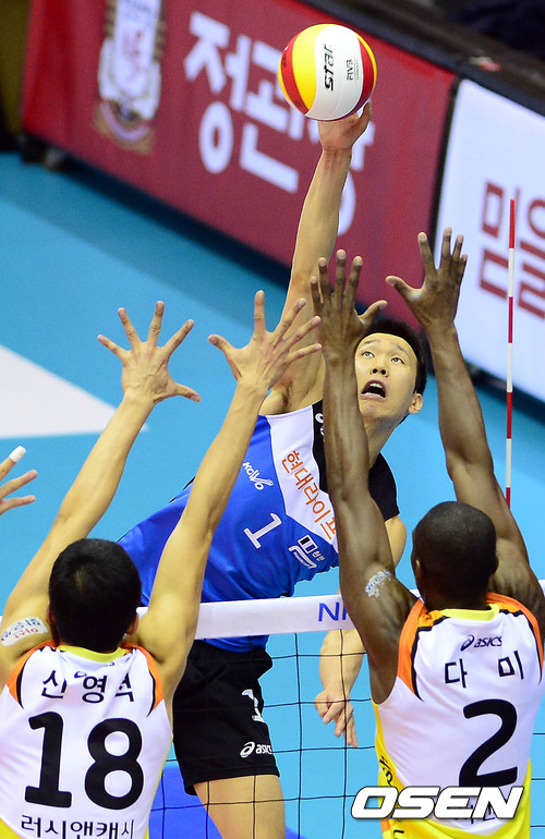 12일 오후 충남 아산시 이순신체육관에서 열린 '2012-2013 NH농협 V-리그' 남자부 아산 러시앤캐시와 천안 현대캐피탈의 경기 2세트 임동규가 공격을 시도하고 있다.