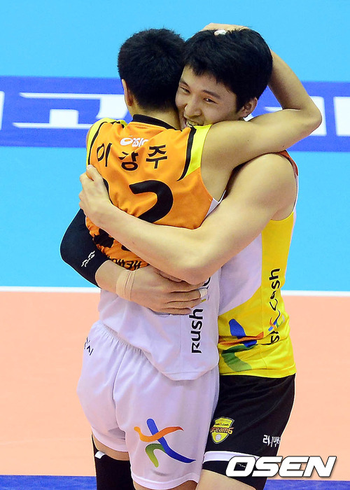 12일 오후 충남 아산시 이순신체육관에서 열린 '2012-2013 NH농협 V-리그' 남자부 아산 러시앤캐시와 천안 현대캐피탈의 경기 4세트 러시앤캐시 이강주와 안준찬이 포옹을 나누고 있다.