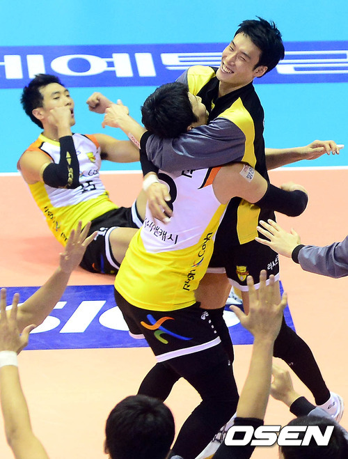 12일 오후 충남 아산시 이순신체육관에서 열린 '2012-2013 NH농협 V-리그' 남자부 아산 러시앤캐시와 천안 현대캐피탈의 경기 종료 후 최홍석과 안준찬이 승리를 기뻐하며 포옹을 나누고 있다.