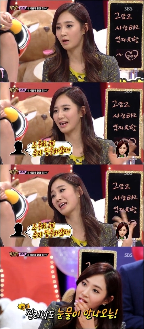 유리는 12일 방송된 SBS 토크쇼 ‘강심장’ 마지막 회에서 “나 때문에 드라마 촬영이 중단된 적이 있다”면서 “뺨을 맞는 연기를 했어야 했는데 연습할 때는 잘 했는데 촬영장에 가니깐 긴장됐다”고 지난 해 방송됐던 ‘패션왕’ 촬영 당시 겪었던 일화를 꺼냈다.