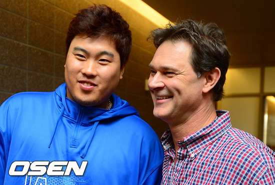 기자회견이 끝나고 류현진이 돈 매팅리 감독과 포즈를 취하고 있다