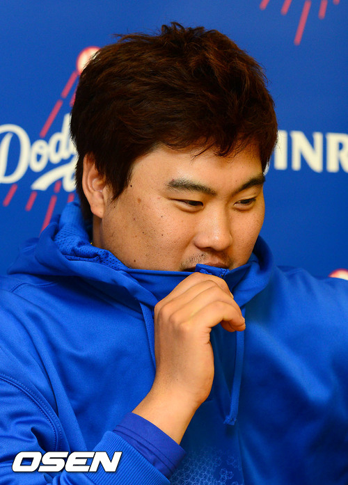 기자회견에서 류현진이 옷으로 수염을 가리고 있다.