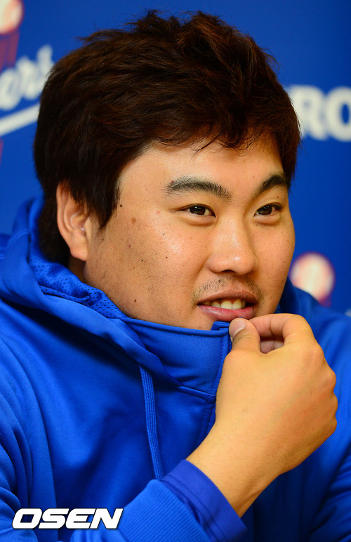 기자회견에서 류현진이 옷으로 수염을 가리고 있다.