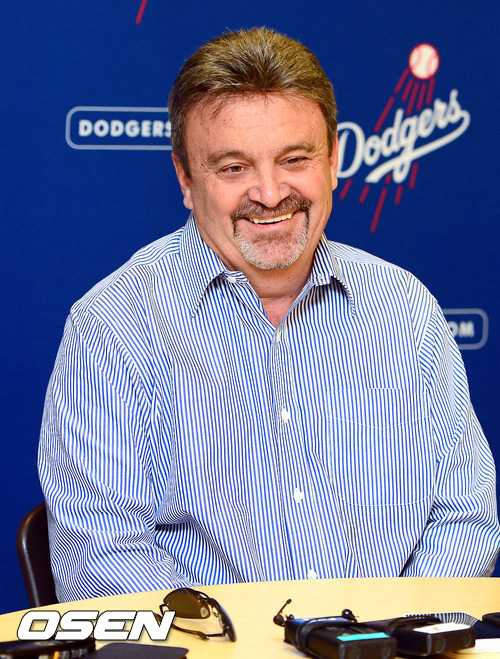 다저스 네트 콜리티 단장이 인터뷰를 하고 있다.
