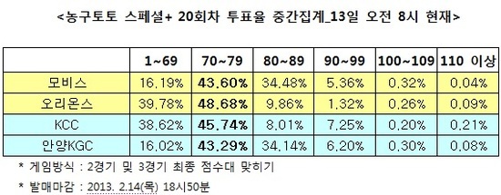 [농구토토] 국민체육진흥공단(www.kspo.or.kr)이 발행하는 체육진흥투표권 수탁사업자인 스포츠토토 공식 온라인 발매 사이트인 베트맨(www.betman.co.kr)은 오는 14일에 펼쳐지는 모비스-오리온스(1경기), KCC-KGC(2경기)전 등 한국프로농구(KBL) 2경기를 대상으로 한 농구토토 스페셜+ 20회차 투표율 중간집계 결과, 두 경기에서 모두 박빙승부를 전망한 참가자가 많은 것으로 나타났다.