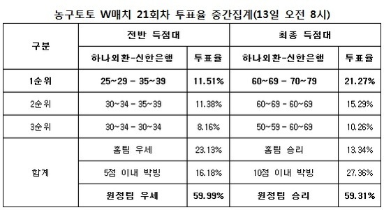 [농구토토] 국민체육진흥공단(www.kspo.or.kr)이 발행하는 체육진흥투표권 수탁사업자인 스포츠토토 공식 온라인 발매사이트인 베트맨(www.betman.co.kr)이 오는 14일 오후 5시 부천실내체육관에서 벌어지는 하나외환-신한은행 전 대상 농구토토 W매치 21회차 투표율을 중간 집계한 결과, 참가자의 59.31%는 원정팀 신한은행이 승리를 거둘 것으로 예상했다.