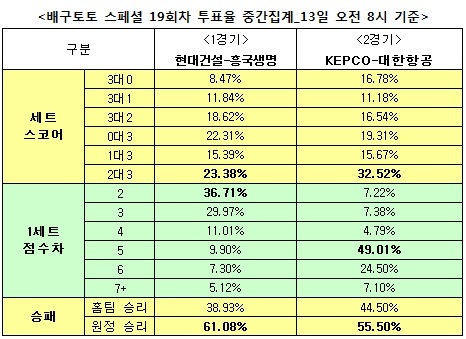 KEPCO의 승리 예상은 44.50%로 나타났고, 최종 세트스코어에서는 2-3 대한항공 승리(32.52%) 예상이 가장 높게 나타났다. 또 1세트 점수차 예상에서는 5점차(49.01%)가 1순위로 집계됐다.