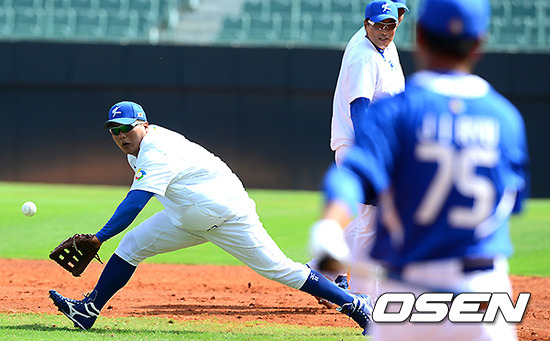 류중일 감독이 직접 펑고를 하며 김태균의 수비 훈련을 지도하고 있다.