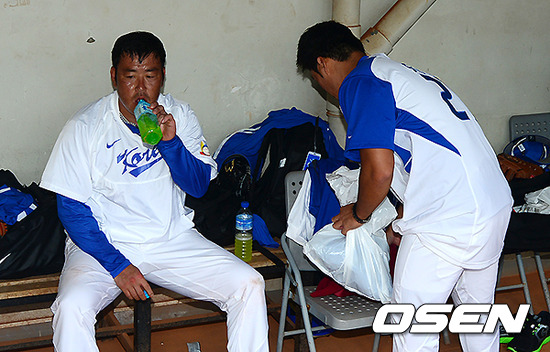 진갑용과 오승환이 오전 훈련을 마치고 더그아웃에서 휴식을 취하고 있다.