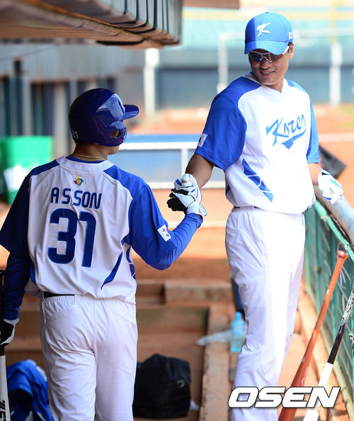 이승엽이 배팅훈련을 마치고 더그아웃으로 향한 손아섭과 주먹을 맞대고 있다.