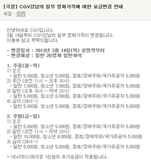 CGV는 전체 91개 관 중 8개 관에서 극장요금 인상을 확정지었다. CGV 측은 12일 공식 홈페이지를 통해 "2월14일과 15일 상영작부터 일부 CGV 극장 영화가격이 변경된다"고 밝히며 CGV강남을 비롯해 CGV상암, CGV목동, CGV야탑, CGV오리, CGV센텀시티, CGV마산, CGV순천, 2월15일에는 CGV동래, CGV아시아드 등에 변경된 가격이 적용된다고 알렸다.