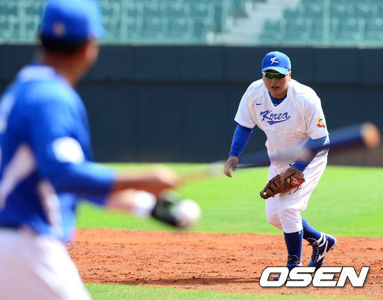 류중일 감독이 직접 펑고를 하며 김태균의 수비 훈련을 지도하고 있다.