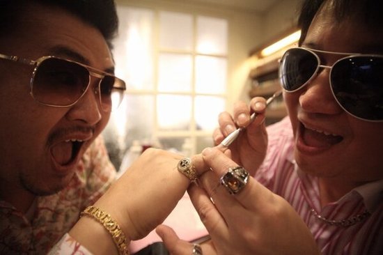 공개된 사진에는 화려한 액세서리, 복고풍 선글라스와 의상을 착용한 정형돈, 데프콘의 모습이 담겨있다. 특히 정형돈은 다정한 모습으로 데프콘의 손톱을 손질해주며 환히 미소 짓고 있어 웃음을 자아낸다.