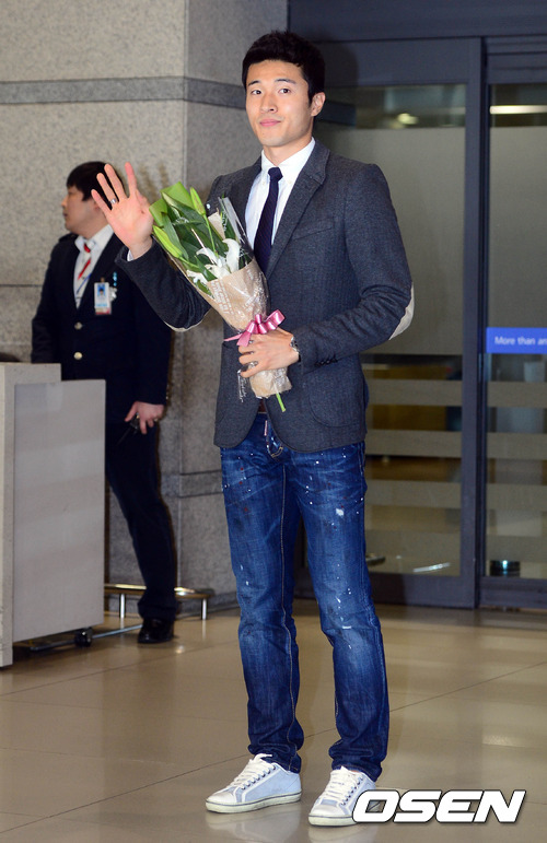 13일 오후 국제올림픽위원회(IOC) 징계위원회에 출석 후 귀국한 박종우가 인천국제공항 입국장에서 취재진들을 향해 손을 흔들고 있다.