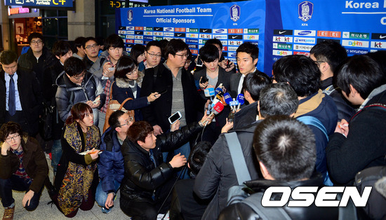 13일 오후 국제올림픽위원회(IOC) 징계위원회에 출석 후 귀국한 박종우가 인천국제공항 입국장에서 취재진들과 인터뷰를 하고 있다.