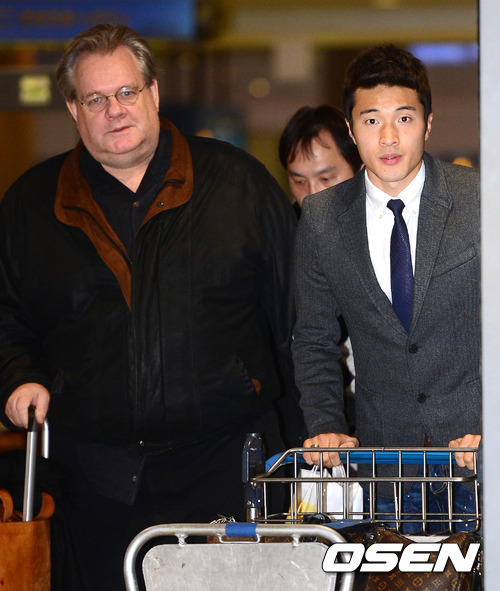 13일 오후 국제올림픽위원회(IOC) 징계위원회에 출석 후 귀국한 박종우가 대한축구협회 국제변호사(왼쪽)과 함께 인천국제공항 입국장을 빠져나오고 있다.
