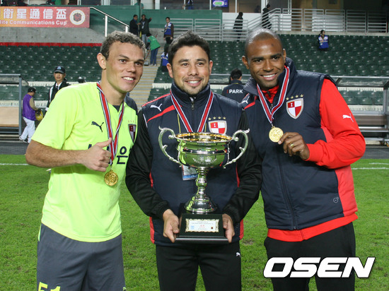부산 아이파크가 홍콩 스타디움에서 열린 구정컵 2013에서 상하이 이스트 아시아를 1-0으로 꺾고 우승을 차지했다. 이로써 부산은 2만5000달러의 우승 상금을 받았고 이 대회 3번째 정상에 오른 한국팀이 됐다. 결승골을 터뜨린 브라질 외국인 선수 파그너(왼쪽)와 데니스 코치, 윌리암이 함께 우승컵을 들고 기뻐하고 있다. / letmeout@osen.co.kr