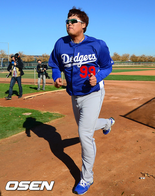 LA 다저스 류현진(26)이 호된 신고식을 치렀다. 메이저리그식 장거리 러닝에 가쁜 숨을 몰아쉬었다. 류현진은 14일(한국시간) 투수-포수조 스프링캠프 둘째 날을 맞아 첫 단체훈련을 소화했다. 스트레칭·장거리 러닝을 비롯해 견제·픽오프·수비훈련을 받으며 메이저리거로서 첫 단체 훈련을 마쳤다.