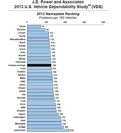 자동차 브랜드 별로는 미국에서 판매되고 있는 31개 브랜드 중 렉서스가 1위(71점), 포르쉐가 2위(94점), 토요타가 링컨과 공동 3위(112점)에 올랐다. 업계 평균은 126점으로 집계됐다. '렉서스'와 '토요타'는 같은 기업에서 2개의 브랜드가 톱3에 들어가는 기염을 토했다.