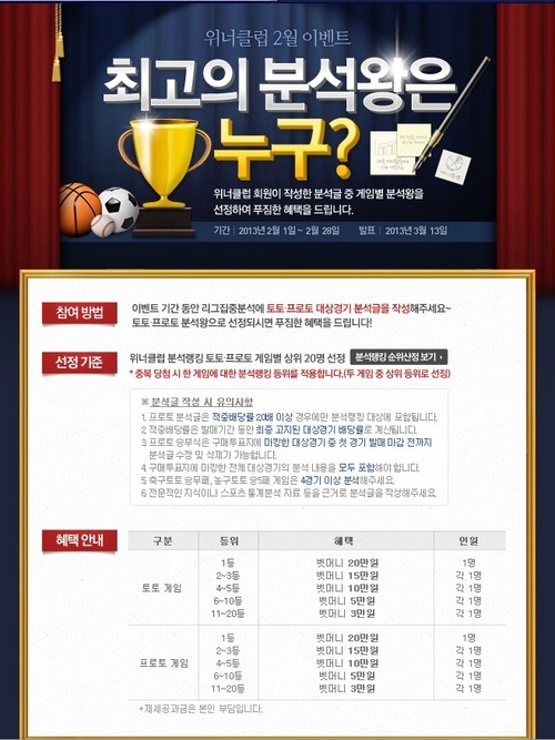 한편 이번 이벤트에서는 위너클럽 회원만을 위한 혜택으로 2월 한달 간 최고의 분석가를 뽑는 '최고의 분석왕은 누구?'를 동시에 진행한다. 이벤트 기간 동안 리그집중분석에 토토와 프로토 대상경기 분석글을 작성하는 회원을 대상으로 진행되는 이번 이벤트는 게임별 분석랭킹 상위 20명을 선정해 벳머니를 증정한다.