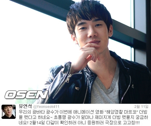 배우 유연석이 애니메이션 ‘해양경찰 마르코’를 통해 더빙 연기를 선보이는 배우 이광수에게 응원의 메시지를 남겼다.