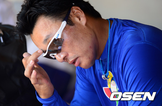 이승엽이 오전훈련을 마치고 더그아웃에서 휴식을 취하고 있다.