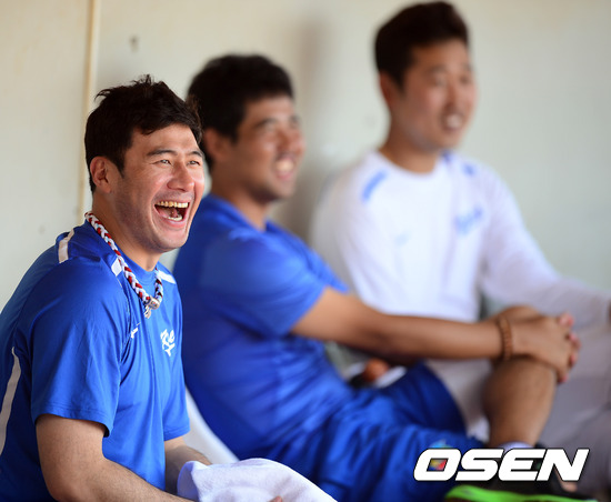 서재응이 더그아웃에서 야수들의 배팅훈련을 지켜보며 즐거워하고 있다.