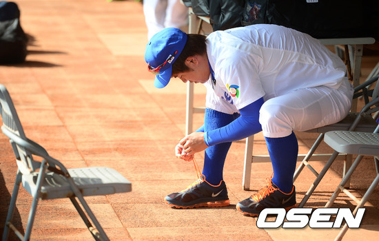 강민호가 더그아웃에서 운동화 끈을 조여 매고 훈련 준비를 하고 있다.
