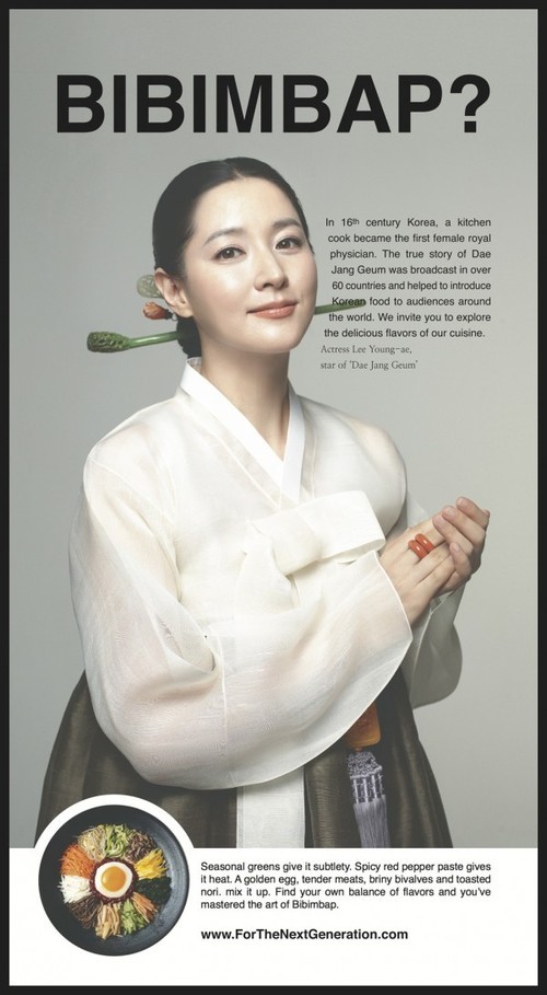 서 교수에 따르면 이번 비빔밥 광고는 뉴욕타임스 13일자 A섹션 15면에 게재됐다. 광고를 살펴보면 이영애가 한복을 곱게 차려입고 드라마 ‘대장금’과 비빔밥을 소개하고 있다.